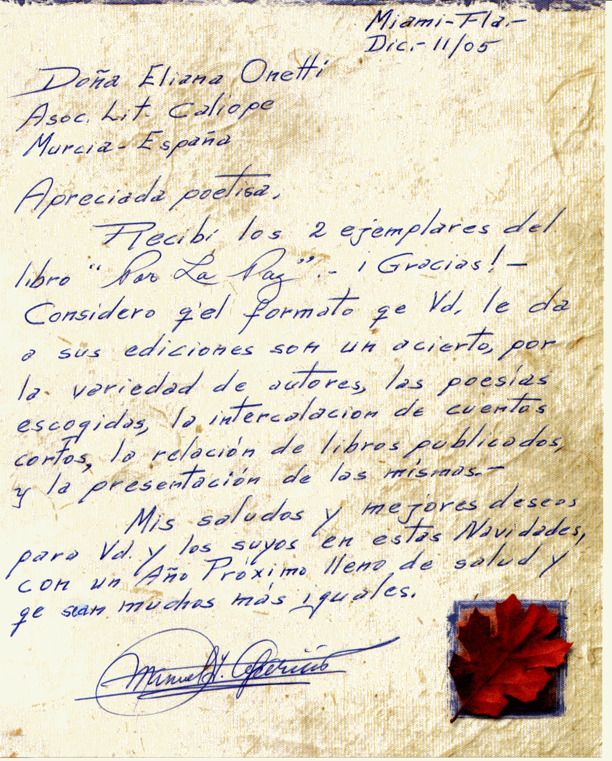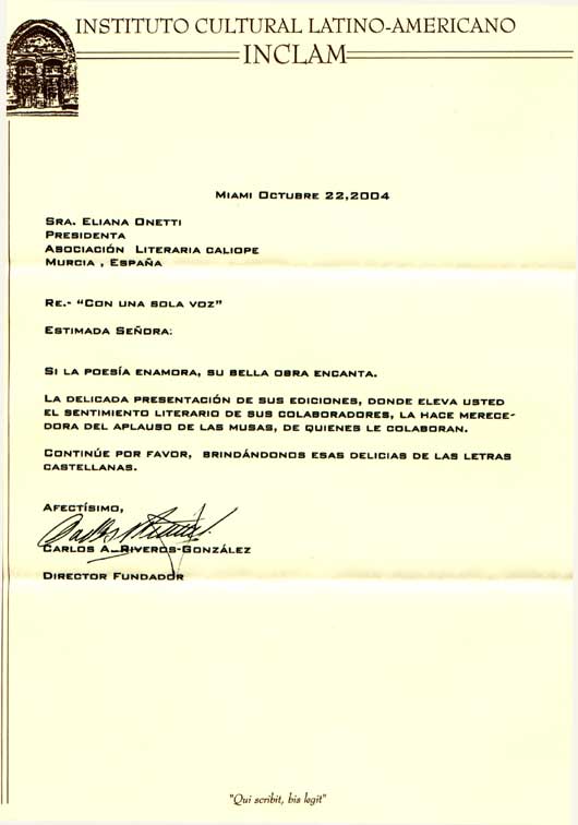 Miami, Octubre 22, 2004 Sra. Eliana Onetti Presidenta Asociación Literaria Calíope