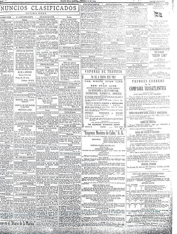 En esta copia del Diario de La Marina de fecha 22 de febrero de 1926 se ve el anuncio de la "The White Star Line" en que anuncian la salida de sus trasatlánticos desde Nueva York a Europa. ¿A qué se debe esto si no eran viajes desde La Habana? Muy simple, viajaban desde La Habana a Nueva York en donde trasbordaban a estos lujosos barcos ingleses y otros con rumbo europeo y destino a España.